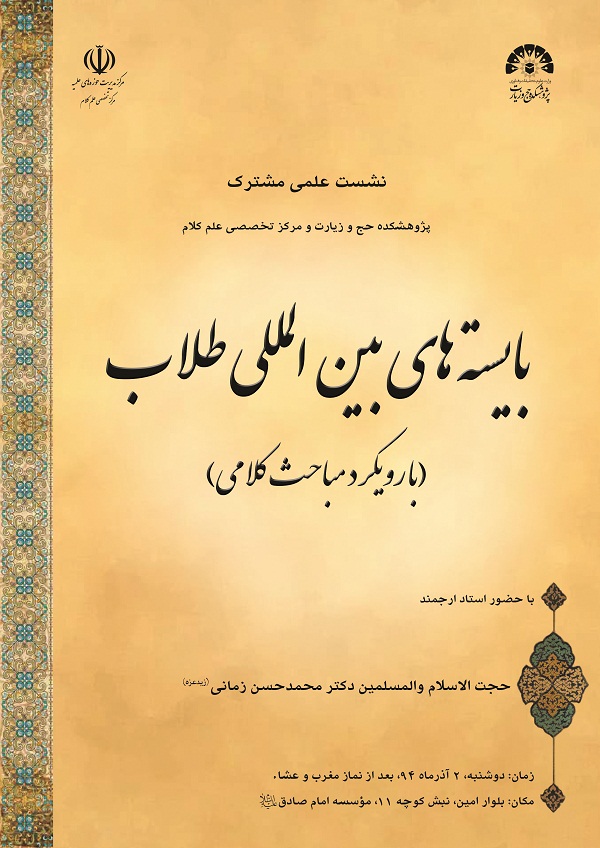 گروه كلام پژوهشكده حج و زيارت با همكاري مركز تخصصي علم كلام، نشست علمي «بايسته هاي علمي طلاب (با رويكرد كلامي)» را برگزار مي كند. اين نشست روز دوشنبه- 2 آذر 1394 بعد از نماز مغرب و عشا در مؤسسه امام صادق (ع) (قم-بلوار امين) برگزار مي گردد.
