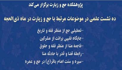 به همت معاونت پژوهشي و گروههاي علمي پژوهشكده حج و زيارت، ده نشست علمي در موضوعات مرتبط با حج و زيارت در ايام ماه ذي الحجه برگزار ميگردد. جدول زمانبندي نشستها در تصوير زير آمده است.