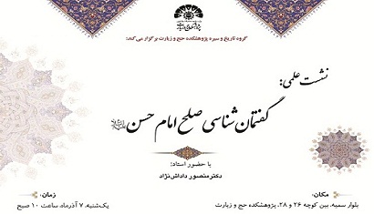 در آستانه شهادت حضرت امام حسن مجتبي (ع) گروه تاريخ و سيره پژوهشكده حج و زيارت نشست علمي «گفتمانشناسي صلح امام حسن (ع)» را روز يكشنبه، هفتم آذر 1395، در محل كتابخانه پژوهشكده (قم، خيابان سميه، بين كوچه 26 و 28) برگزار مي كند.