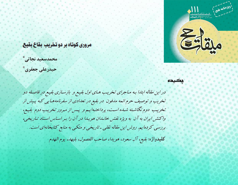 در اين مقاله ابتدا به ماجراي تخريب هاي اول بقيع و بازسازي بقيع در فاصله دو تخريب و توصيف حرم ائمه مدفون در بقيع در تعدادي از سفرنامههايی که پيش از تخريب دوم نگاشته شده است، پرداختهايم و پس از مرور تخريب دوم بقيع، واکنش ايران به آن به ويژه نقش خاندان هويدا در آن را بر اساس اسناد تاريخي، بررسي کردهايم. روش اين مقاله نقلي ـ تاريخي و متکي به منابع کتابخانهای است.