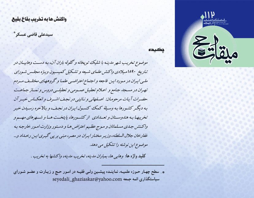 موضوع تخریـب شهر مدینـه با شلیک توپخانه و گلوله باران آن، بـه دسـت وهابیـان در تـاریخ 1890مـیلادی واکنش علمای شیعه و تشکیل کمیسیون ویژه مجلس شورای ملـی ایـران در مـورد ایـن فاجعه و اجتماع اعتراضـی علمـا و گروههـای مختلـف مـردم تهـران در مسـجد جـامع و اعـلام تعطیـل عمـومی و تعطیلـی دروس و نمـاز جماعـت حضـرات آیـات مرحومـان: اصـفهانی و نـائینی در نجـف اشـرف و انعکـاس خبـر آن بـه دیگـر کشـورها بـه وسـیلة کمک کنسول ایران در نجف، و بالاخره رسیدن خبر تخریبها به هندوسـتان و تعـدادی از کشـورها، پایتخـت هـا و شـهرهای مهـم و واکـنش جـدی مسـلمانان و مـوج عظـیم اعتراض ها و دستور وزارت امور خارجه به غفارخان جلال السلطنه، وزیـر مختـار ایـران در مصر، مبنی بر پی گیری این رخداد و... موضوع این نوشته را تشکیل می دهد.