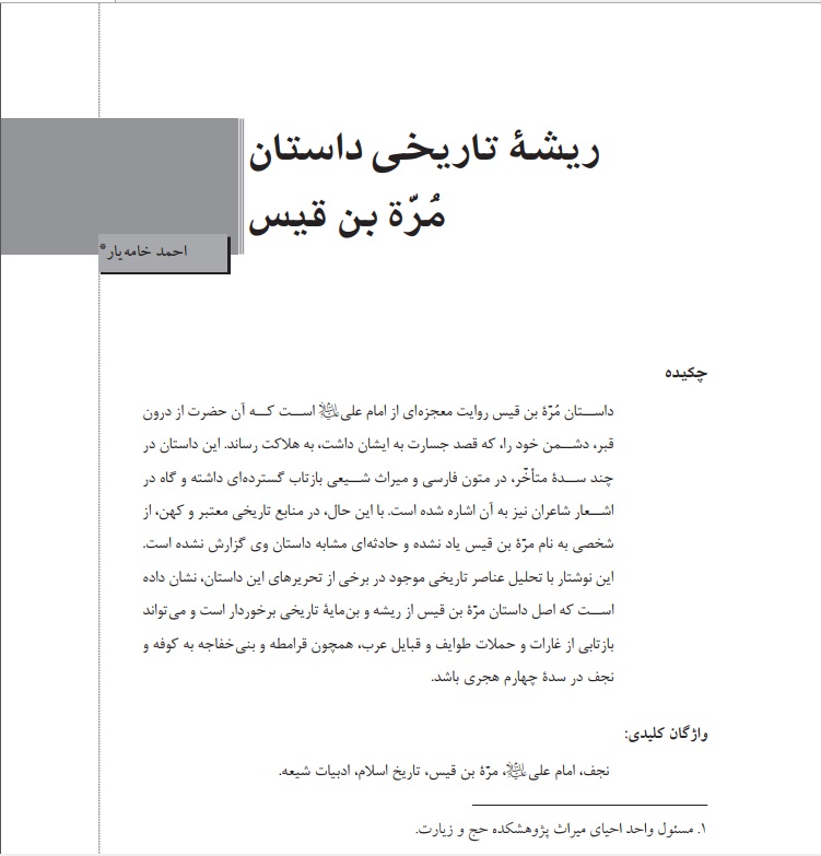 اين نوشتار با تحليل عناصر تاريخي موجود در برخي از تحريرهاي اين داستان، نشان داده ّ اســت که اصل داستان مرة بن قيس از ريشه و بنماية تاريخي برخوردار است و ميتواند بازتابي از غارات و حمات طوايف و قبايل عرب، همچون قرامطه و بنيخفاجه به کوفه و نجف در سده چهارم هجري باشد.