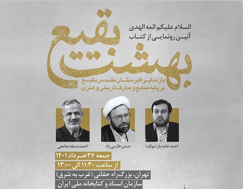 آئین رونمایی از کتاب "بهشت بقیع: بازنمایی قبرستان مقدس بقیع بر پایه منابع و مدارک تاریخی و هنری" نوشته دکتر احمد خامهیار (مسئول واحد احیای تراث پژوهشکده حج و زیارت) روز جمعه 27 خرداد 1401 در کتابخانه ملی ایران برگزار میشود.
