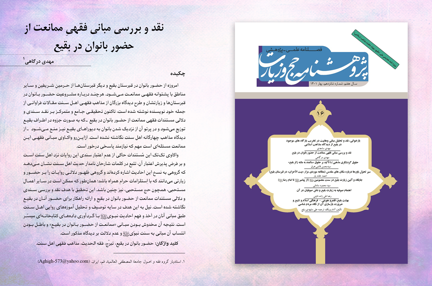 امروزه از حضور بانوان در قبرستان بقیع و دیگر قبرستانها از حرمین شریفین و سایر مناطق با پشتوانه فقهی ممانعت میشود. هرچند درباره مشروعیت حضور بانوان در قبرستانها و زیارتشان و طرح دیدگاه بزرگان از مذاهب فقهی اهل سنت مقالات فراوانی از جمله خود نویسنده نوشته شده است، تاکنون تحقیقی جامع و متمرکز بر نقد سندی و دلالی مستندات فقهی ممانعت از حضور بانوان در بقیع ـ که به صورت جزوه در اطراف بقیع توزیع میشود و در پرتو آن از نزدیک شدن بانوان به دیوراهای بقیع نیز منع میشود ـ از دیدگاه مذاهب چهارگانه اهل سنت نگاشته نشده است. ازاینرو واکاوی مبانی فقهی این ممانعت مسئلهای است مهم که نیازمند پاسخی درخور است.
