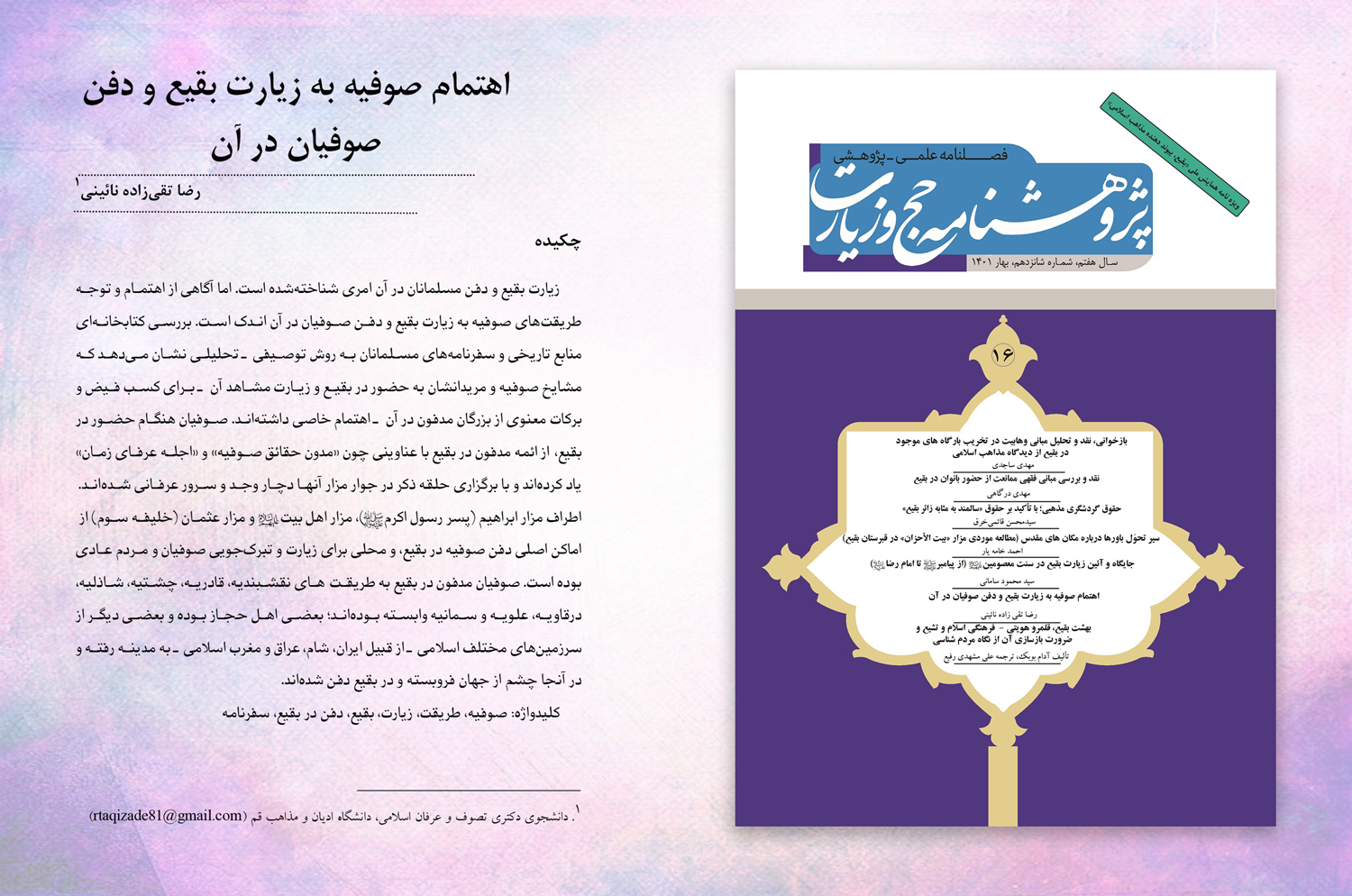 زیارت بقیع و دفن مسلمانان در آن امری شناختهشده است. اما آگاهی از اهتمام و توجه طریقتهای صوفیه به زیارت بقیع و دفن صوفیان در آن اندک است. بررسی کتابخانهای منابع تاریخی و سفرنامههای مسلمانان به روش توصیفی ـ تحلیلی نشان میدهد که مشایخ صوفیه و مریدانشان به حضور در بقیع و زیارت مشاهد آن ـ برای کسب فیض و برکات معنوی از بزرگان مدفون در آن ـ اهتمام خاصی داشتهاند. صوفیان هنگام حضور در بقیع، از ائمه مدفون در بقیع با عناوینی چون «مدون حقائق صوفیه» و «اجله عرفای زمان» یاد کردهاند و با برگزاری حلقه ذکر در جوار مزار آنها دچار وجد و سرور عرفانی شدهاند. اطراف مزار ابراهیم (پسر رسول اکرم ص)، مزار اهل بیت: و مزار عثمان (خلیفه سوم) از اماکن اصلی دفن صوفیه در بقیع، و محلی برای زیارت و تبرکجویی صوفیان و مردم عادی بوده است. صوفیان مدفون در بقیع به طریقتهای نقشبندیه، قادریه، چشتیه، شاذلیه، درقاویه، علویه و سمانیه وابسته بودهاند؛ بعضی اهل حجاز بوده و بعضی دیگر از سرزمینهای مختلف اسلامی ـ از قبیل ایران، شام، عراق و مغرب اسلامی ـ به مدینه رفته و در آنجا چشم از جهان فروبسته و در بقیع دفن شدهاند.