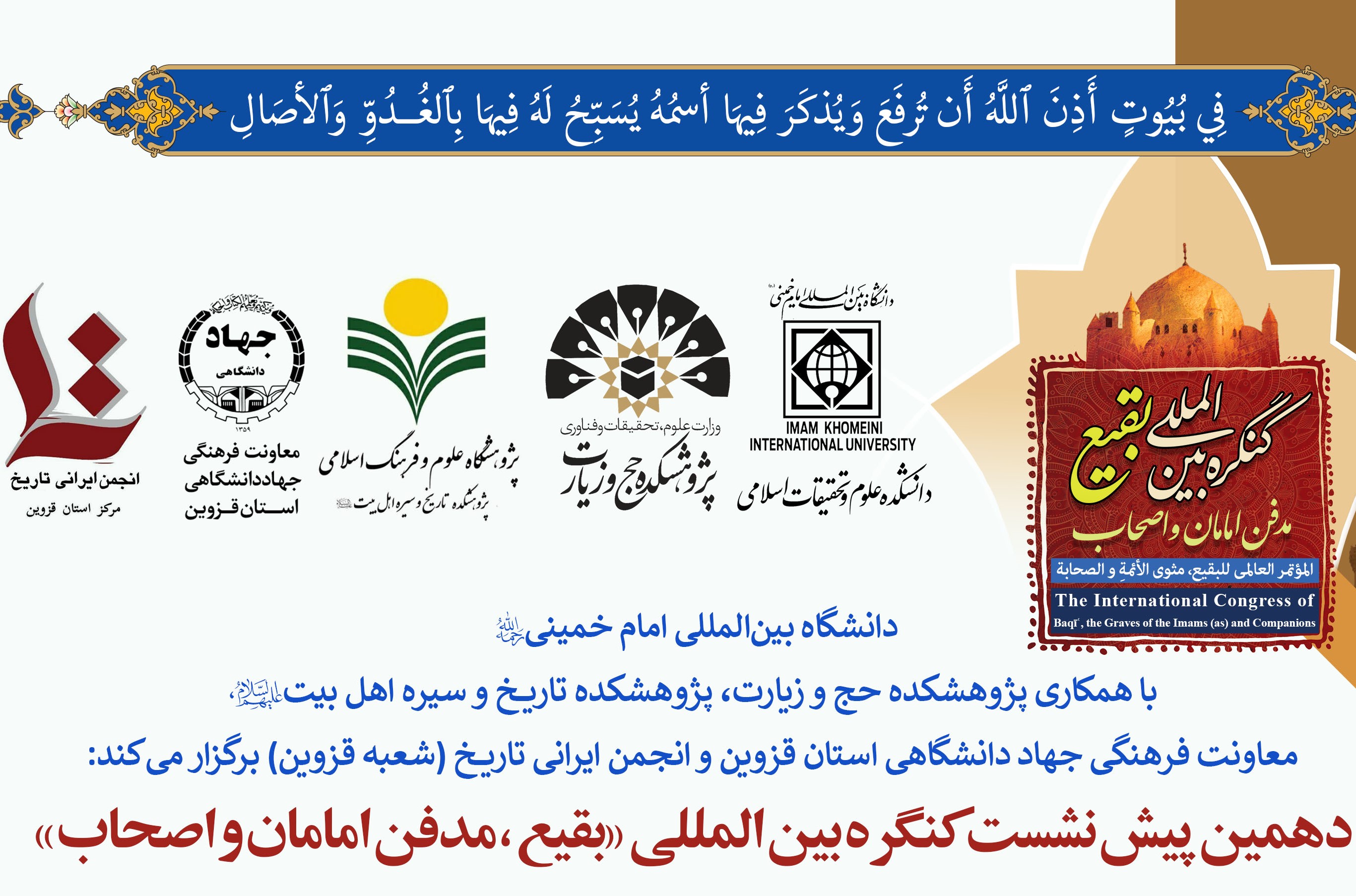 پژوهشکده حج و زیارت با همکاری دانشگاه بین المللی امام خمینی قزوین و معاونت فرهنگی جهاد دانشگاهی قزوین و انجمن ایرانی تاریخ (قزوین) دهمین پیشنشست کنگره بین المللی "بقیع؛ مدفن امامان و اصحاب" را با موضوع «تحلیل فقهی، کلامی و تاریخی زیارت ائمه بقیع» در روز دوشنبه ۱۱ دی ماه ساعت ۱۰-۱۲ در دانشگاه بین المللی امام خمینی قزوین، دانشکده علوم و تحقیقات اسلامی، سالن علامه رفیعی برگزار میکند.