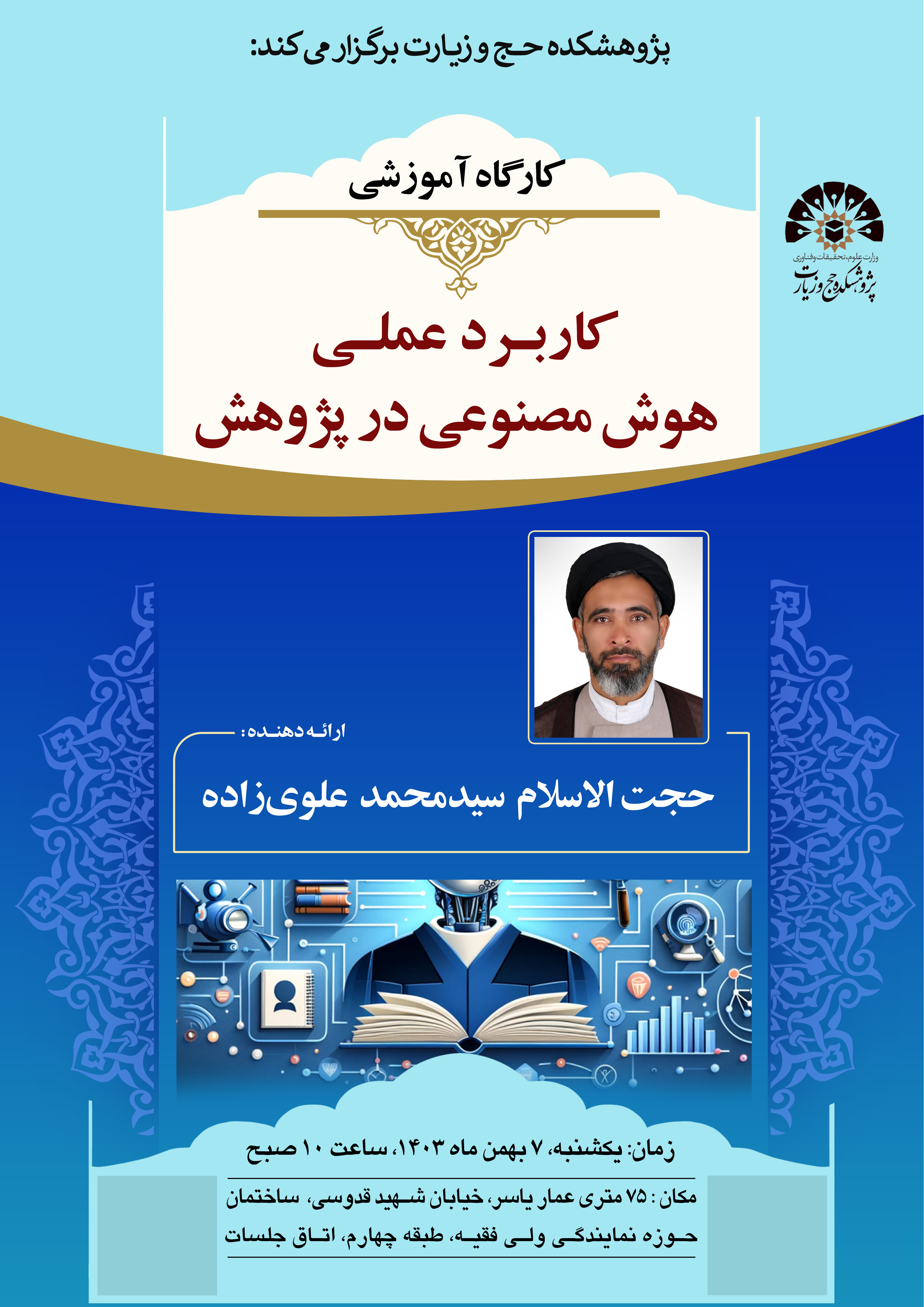 پژوهشکده حج و زیارت نیز به منظور بهرهگیری از این ظرفیت، تا کنون چندین نشست و کارگاه آموزشی برای آشنایی با هوش مصنوعی برگزار کرده است؛ و اکنون در ادامهی این اقدامات، کارگاه آموزشی