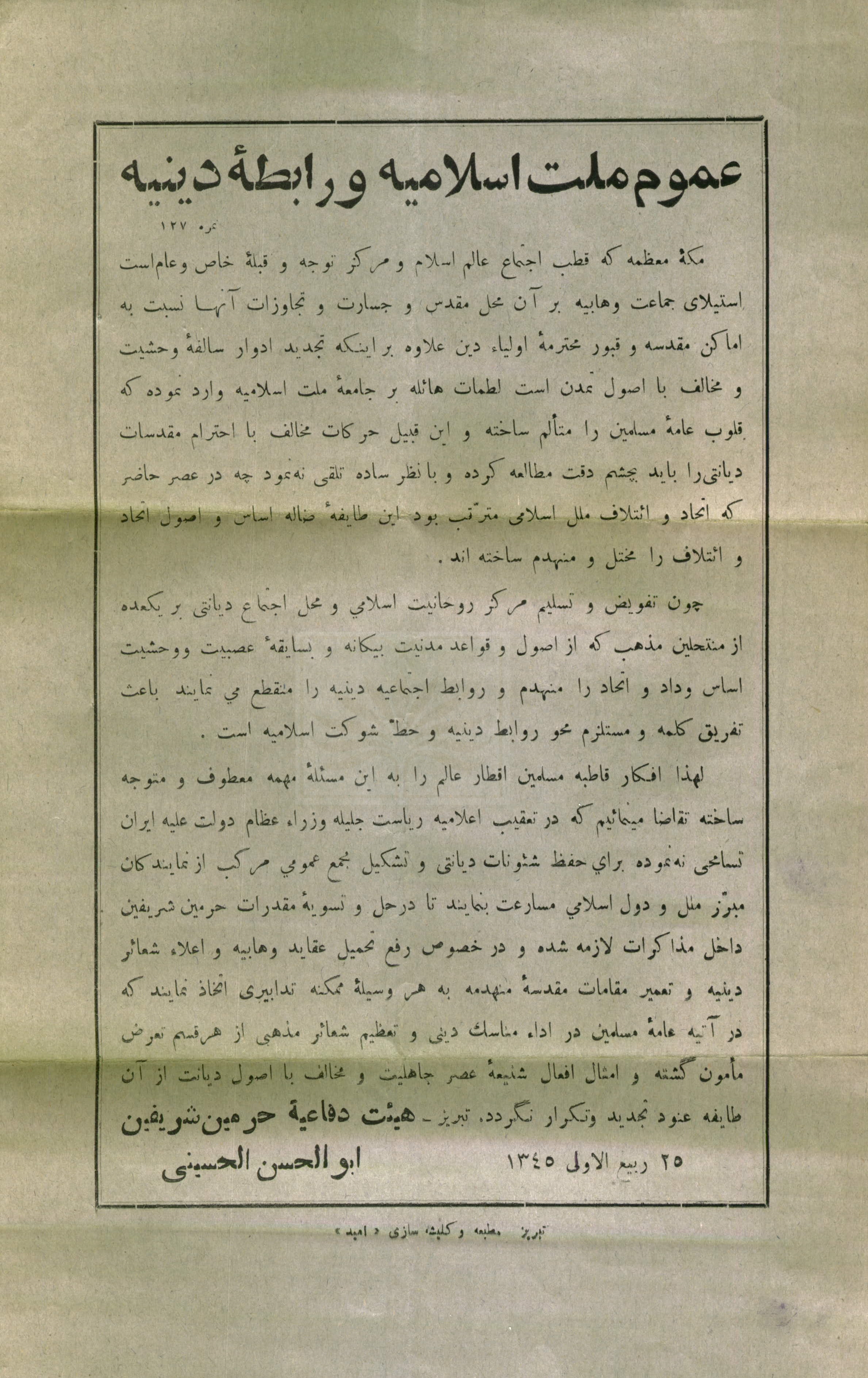 لهذا افکار قاطبه مسلمين اقطار عالم را به اين مسئله مهمه معطوف و متوجه ساخته تقاضا مينمائيم که در تعقيب اعلاميه رياست جليله وزراء عظام دولت عليه ايران تسامحي نه نموده براي حفظ شئونات ديانتي و تشکيل مجمع عمومي مرکب از نمايندگان مبرز ملل و دول اسلامي مسارعت بنمايند تا در حل و تسويه مقدرات حرمين شريفين داخل مذاکرات لازمه شده و در خصوص رفع تحميل عقايد وهابيه و اعلاء شعائر دينيه و تعمير مقامات مقدسة منهدمه به هر وسيلة ممکنه تدابيري اتخاذ نمايند که در آتيه عامة مسلمين در اداء مناسک ديني و تعظيم شعائر مذهبي از هر قسم تعرض مأمون گشته و امثال افعال شيعة عصر جاهليت و مخالف با اصول ديانت از آن طايفه عنود تجديد و تکرار نگردد.