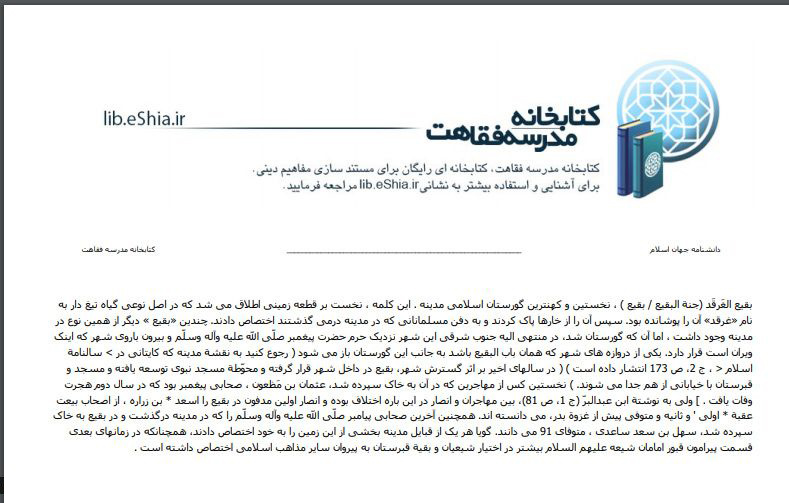 بَقیع یا بقیعُ الغَرْقَد، کهنترین قبرستان مسلمانان و محل دفن چهار تن از امامان شیعه و دیگر وابستگان پیامبر خدا. بقیع پیش از اسلام، زمینی بزرگ و بوستانی در حوالی شهر یثرب حجاز بود. دفن اموات مسلمانان در این زمین از آغاز سده نخست هجری، رواج یافته و بزرگان و شخصیتهای مهم اسلامی در آن خاکسپاری شدهاند. بقیع در ادوار مختلف اسلامی، مورد توجه حاکمان بوده و بقعهها و بارگاههایی در آن ساخته شد اما پس از حمله و سیطره وهابیان بر عربستان، تخریب گردید. اکنون سطح بقیع در جوار حرم نبوی با خاک یکسان است و سنگ نوشتهای در آن مشاهده نمیشود.
