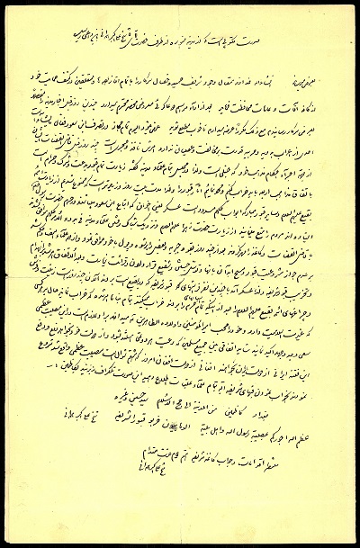 ان شاء الله خداوند متعال وجود شريف حميده‌خصال سرکار را با تمام آقازاده ها و متعلقین در کنف حمايت خود، از کافه آفات و عاهات محافظت فرمايد. بعد از اداي مراسم دعاگويي معروض محضر محترم مي‌دارد، چندين روز قبل اخبار مدينه ار مفصلاً به عرض سرکار رسانيد، مع ذلک مکرراً عرضه مي‌دارم تا خوب مطلع شويد؛ عرض نمود: