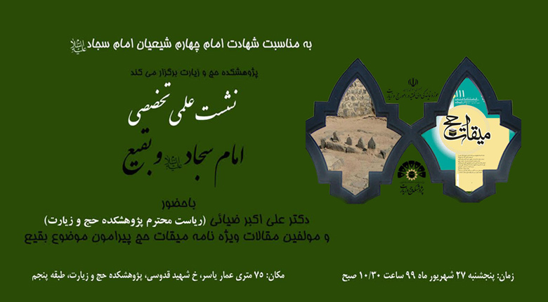 نشست علمی ـ تخصصی «امام سجاد (ع) و بقیع» روز پنج شنبه، ۲۷ شهریور ۱۳۹۹ به همت واحد بقیعپژوهی در سالن جلسات واقع در طبقه پنجم پژوهشکده حج و زیارت برگزار می شود.