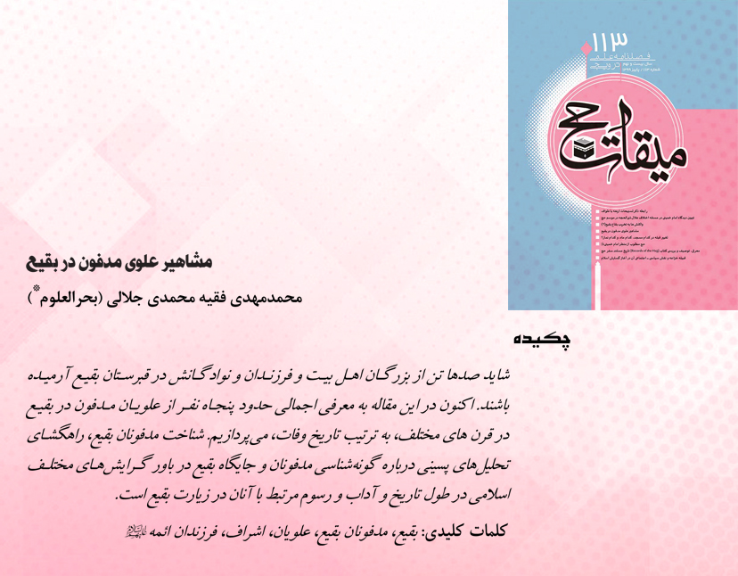 شاید صدها تن از بزرگان اهل بیت و فرزندان و نوادگانش در قبرستان بقیع آرمیده باشند. اکنون در این مقاله به معرفی اجمالی حدود پنجاه نفر از علویان مدفون در بقیع در قرن های مختلف، به ترتیب تاریخ وفات، میپردازیم. شناخت مدفونان بقیع، راهگشای تحلیلهای پسینی درباره گونهشناسی مدفونان و جایگاه بقیع در باور گرایشهای مختلف اسلامی در طول تاریخ و آداب و رسوم مرتبط با آنان در زیارت بقیع است.