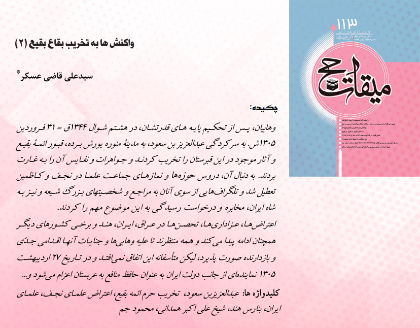 وهابیان، پس از تحکیم پایه های قدرتشان، در هشتم شوال 1344ق = 31 فروردین 1305ش. به سرکردگی عبدالعزیز بن سعود، به مدینه منوره یورش برده، قبور ائمه بقیع و آثار موجود در این قبرستان را تخریب کردند و جواهرات و نفایس آن را به غارت بردند. به دنبال آن، دروس حوزهها و نمازهای جماعت علما در نجف و کاظمین تعطیل شد و تلگرافهایی از سوی آنان به مراجع و شخصیتهای بزرگ شیعه و نیز به شاه ایران، مخابره و درخواست رسیدگی به این موضوع مهم را کردند.