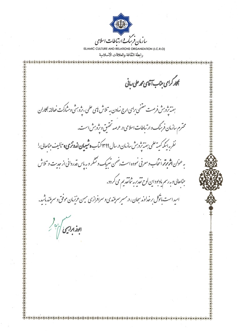 در بخش کتاب و ترجمه، کتاب تألیفی «شیعه در اندونزی: بازتابهای تاریخی و معاصر» نوشته محمدعلی ربانی (رایزن فرهنگی ایران در هند) به عنوان کتاب برتر شناخته شد. این کتاب در گروه تاریخ و سیره پژوهشکده حج و زیارت تهیه شده و در آذر ماه ۱۳۹۹ توسط نشر مشعر در ۲۹۶ صفحه و در قطع وزیری منتشر شده است.