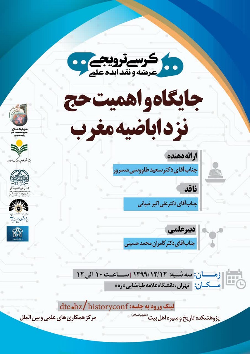 پژوهشکده حج و زیارت با همکاری پژوهشکده تاریخ و سیره اهل بیت (ع) (وابسته به پژوهشگاه علوم و فرهنگ اسلامی)، کرسی علمی ترویجی «جایگاه و اهمیت حج نزد اباضیه مغرب» را به عنوان پیشنشستِ همایش بین المللی «مغرب اسلامی، حج و حرمین شریفین» را روز سهشنبه 12 اسفند ۱۳۹۹ ساعت ۱۰ الی 12 صبح برگزار مینماید. دکتر سعید طاووسی مسرور در این نشست به عنوان ارائهدهنده بحث، دکتر علیاکبر ضیائی به عنوان ناقد و آقای کامران محمدحسینی به عنوان دبیر علمی نشست حضور دارند.