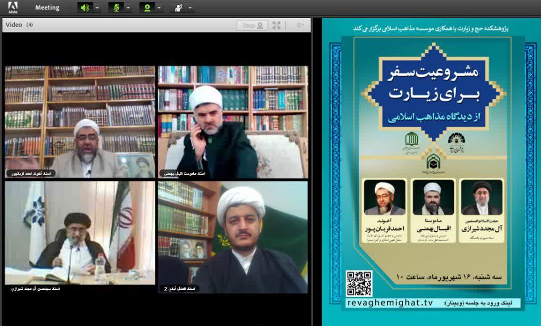 نشست علمی «مشروعیت سفر برای زیارت از دیدگاه مذاهب اسلامی» روز سه شنبه 16 شهریور با حضور حجت الاسلام والمسلمین آلمجدد شیرازی از اساتید حوزه و دانشگاه، ماموستا اقبال بهمنی، مدرس و مسئول دبیرخانه ائمه جمعه اهل سنت کردستان، آخوند احمد قربانپور مدرس و عضو شورای افتاء محفل فقهی احناف ترکمن صحرا در بستر فضای مجازی برگزار گردید.