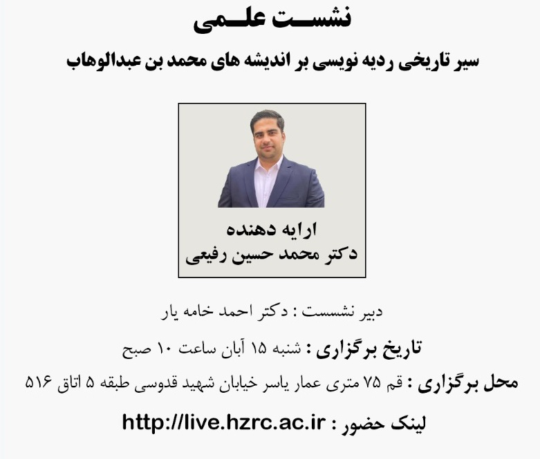 با توجه به اهمیت این موضوع، پژوهشکده حج و زیارت نشستی علمی با موضوع «سیر تاریخی ردیهنویسی بر اندیشههای محمد بن عبدالوهاب» برگزار میکند. ارائه دهنده این نشست، آقای دکتر محمدحسین رفیعی، متخصّص تاریخ وهابیت و دارای کتاب و مقالههای متعدّد در این زمینهاند. این نشست در روز شنبه 15 آبان ماه، از ساعت 10 تا 12 صبح، در ساختمان حوزه نمایندگی ولی فقیه در امور حج و زیارت (قم، بلوار 75 متری عمار یاسر، خیابان شهید قدوسی، طبقه پنجم، اتاق 516) برگزار خواهد شد.