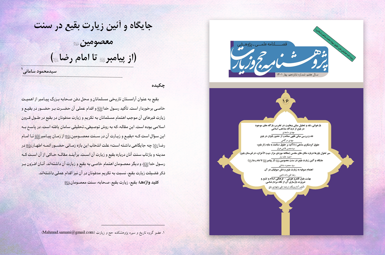 بقیع به عنوان آرامستان تاریخی مسلمانان و محل دفن صحابه بزرگ پیامبر از اهمیت خاصی برخوردار است. تأکید رسول خدا(ص) و اقدام عملی آن حضرت بر حضور در بقیع و زیارت قبرهای آن موجب اهتمام مسلمانان به تکریم و زیارت مدفونان در بقیع در طول قرون اسلامی بوده است. این مقاله، که به روش توصیفیـ تحلیلی سامان یافته است، در پاسخ به این سؤال است که «بقیع و زیارت آن در سنت معصومین: از زمان پیامبر(ص) تا امام رضا(ع) چه جایگاهی داشته است» علت انتخاب این بازه زمانی حضور ائمه اطهار: در مدینه و بازتاب سنت آنان درباره بقیع و زیارت آن است. برآیند مقاله حاکی از آن است که رسول خدا(ص)، و دیگر معصومان اهتمام خاصی به بقیع و زیارت آن داشتهاند. آنان افزون بر ذکر فضیلت زیارت بقیع، نسبت به تکریم مدفونان در آن نیز اقدام عملی داشتهاند.