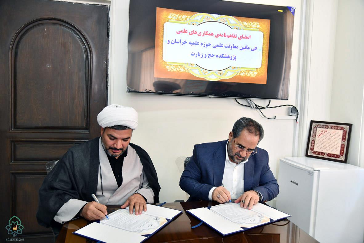 تفاهمنامه همکاریهای علمی- پژوهشی بین پژوهشکده حج و زیارت و معاونت علمی حوزه علمیه خراسان به امضاء رسید. این تفاهم نامه با حضور حجتالاسلام و المسلمین حسین کندری، معاون علمی حوزه علمیه خراسان و دکتر میرزا علیزاده، رئیس پژوهشکده حج و زیارت و حجتالاسلام والمسلمین دکتر احمری، نماینده بعثه مقام معظم رهبری در خراسان رضوی، امضا شد.