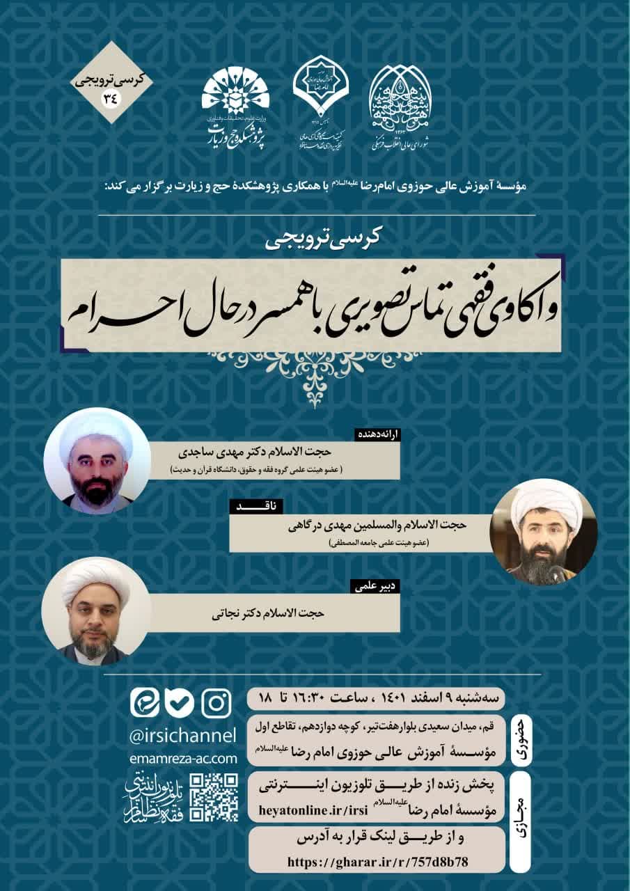 کرسی ترویجی "واکاوی فقهی تماس تصویری با همسر در حال احرام" با ارائه حجت الاسلام دکتر مهدی ساجدی، عضو گروه فقه و حقوق پژوهشکده حج وزیارت توسط موسسه آموزش عالی حوزوی امام رضا(ع) با همکاری پژوهشکده حج و زیارت برگزار میشود.
