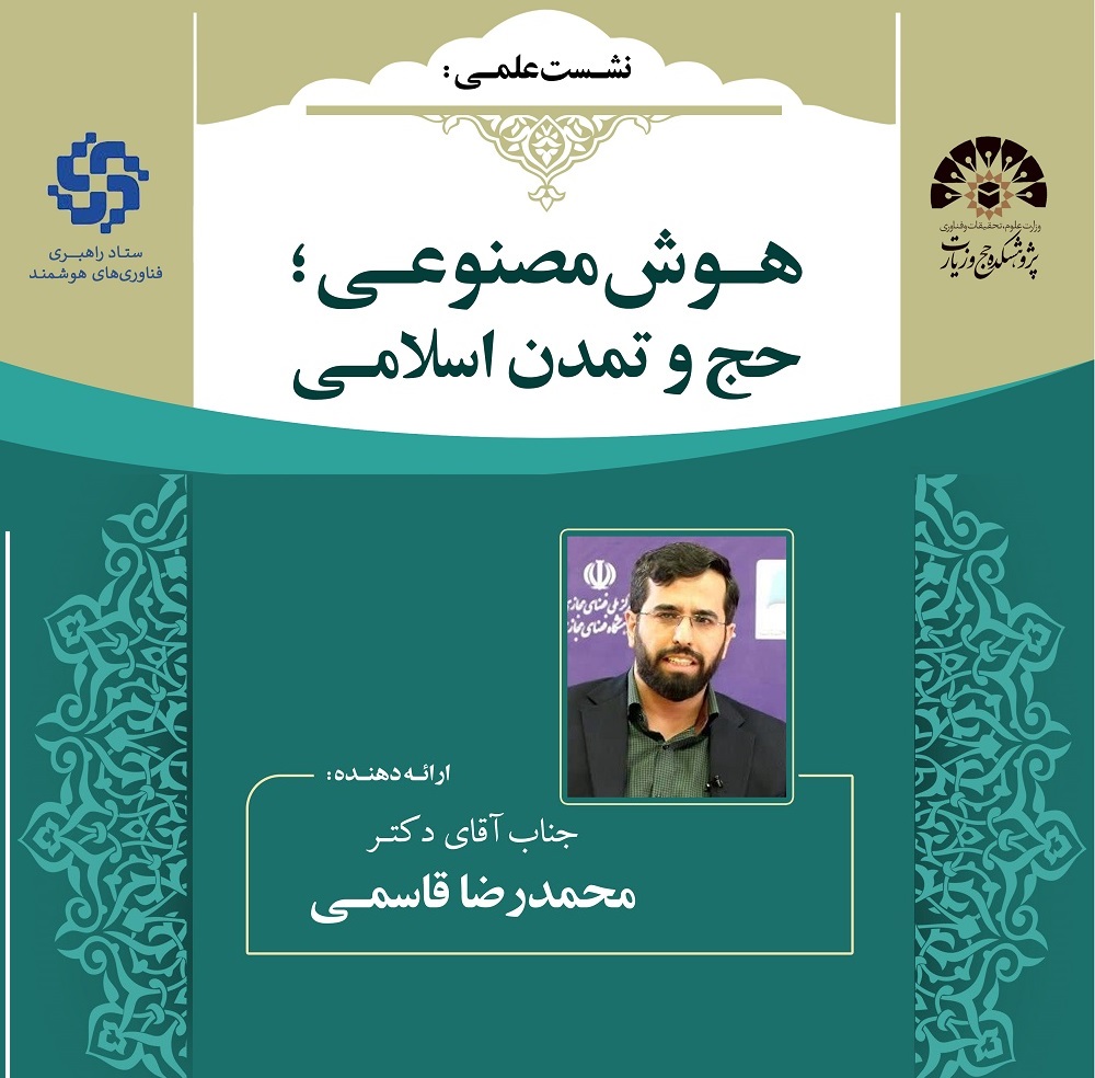 به همت پژوهشکده حج و زیارت نشست علمی «هوش مصنوعی؛ حج و تمدن اسلامی» با سخنرانی و ارائه دکتر محمدرضا قاسمی روز چهارشنبه 12 مهر ماه 1402 در سالن جلسات پژوهشکده برگزار میشود.