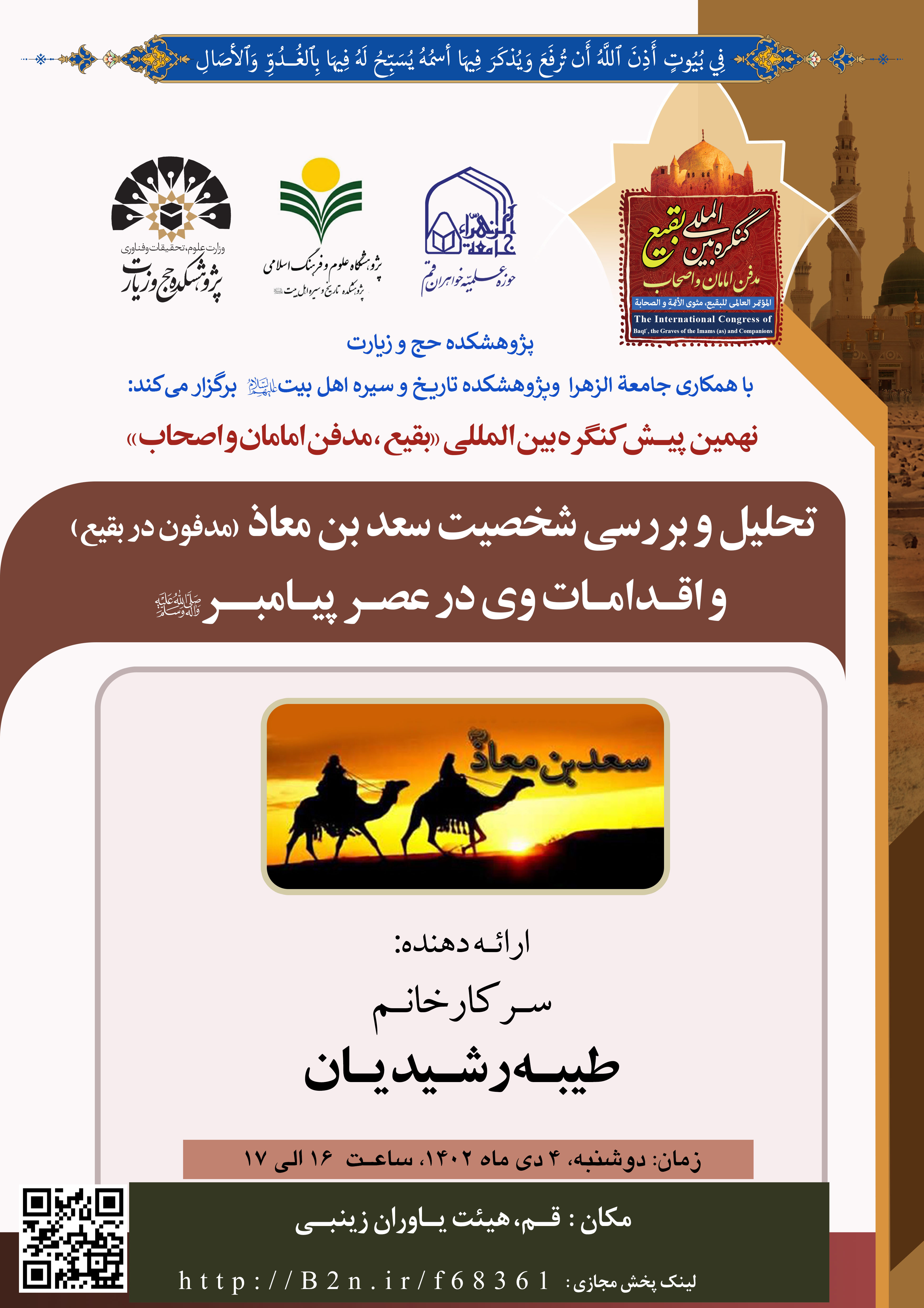 نهمین پیش نشست کنگره بین المللی «بقیع، مدفن امامان و اصحاب» با عنوان «تحلیل و بررسی شخصیت سعد بن معاذ (مدفون در بقیع) و اقدامات وی در عصر پیامبر (ص)» به همت پژوهشکده حج و زیارت و با همکاری جامعة الزهرا و پژوهشکده تاریخ و سیره اهل بیت روز دوشنبه ۴ دیماه ۱۴۰۲ ساعت از ۱۶ الی ۱۷ با ارائهی سرکار خانم طیبه رشیدیان در محل هیئت یاوران زینبی در قم برگزار میگردد.